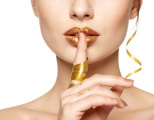 With a smoldering gaze and stylish glasses, the enchanting model entices to keep secrecy, urging them to embrace privacy with finger on her lips isolated on a png background.
