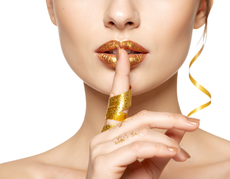 A close-up portrait showcases a woman with golden glitter lips and a finger pressed against them in a "shush" gesture, wrapped in gold