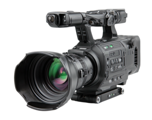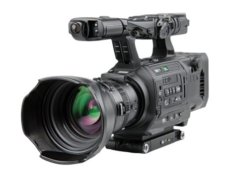 Professional black video camera with lens and controls on black bg
