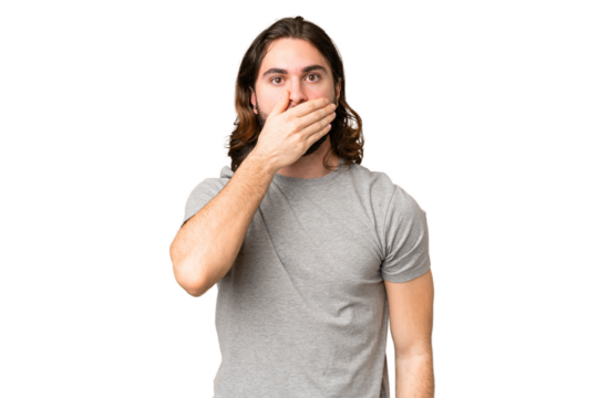 Young handsome man over isolated chroma key background covering mouth with hand