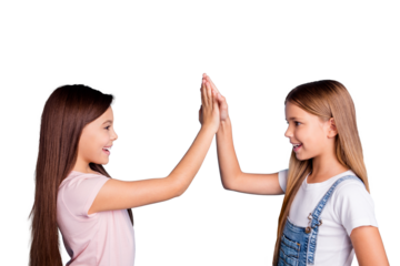 Smiling sweet sisters hugging in floral white dresses with transparent background