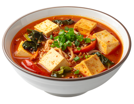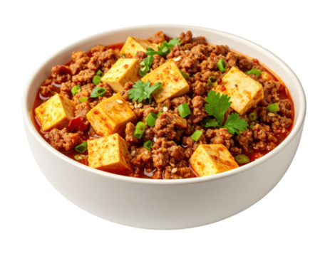 Bowl of spicy mapo tofu with minced meat and green onions isolated on a transparent background food asian