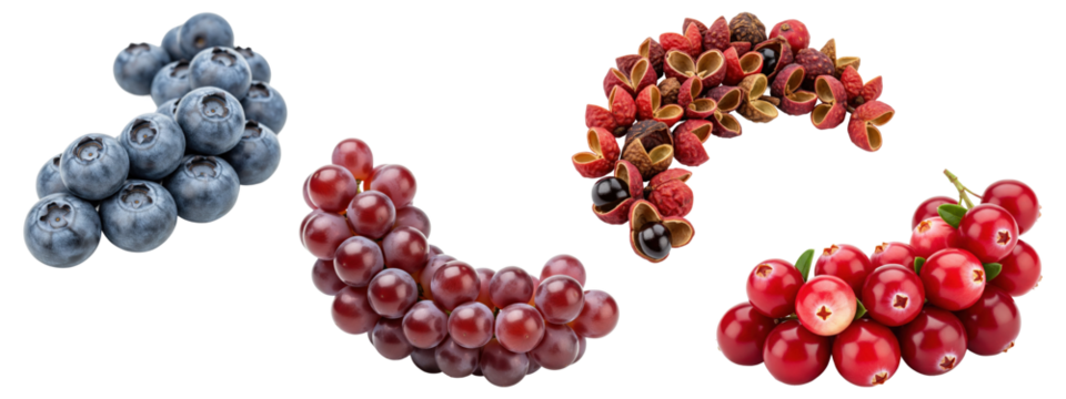 A collection of fresh berries and spices, including blueberries, grapes, cranberries, and sichuan peppercorns.