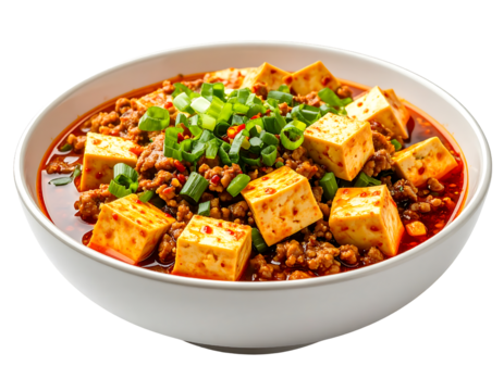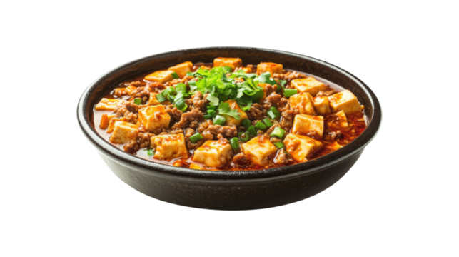 Mapo Tofu in Dark Bowl isolated on a transparent background