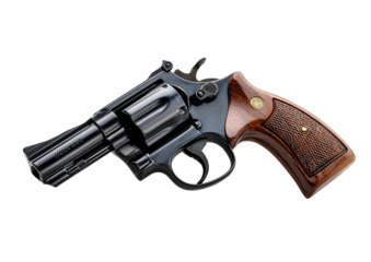 Shiny revolver with wood grips, side view, isolated