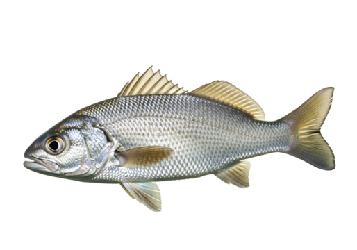 A side profile of a silvery fish, showcasing detailed scales and fins against a pure black backdrop.