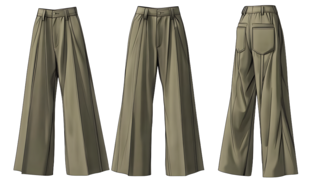 accurate technical fashion drawing of high waisted wide leg trousers featuring front pleats side pockets belt loops clean lines a khaki color front view and detailed black and white side and back