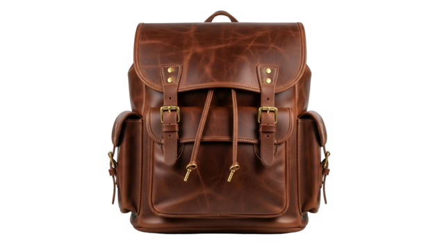Sturdy brown leather satchel style backpack isolated against a solid black background