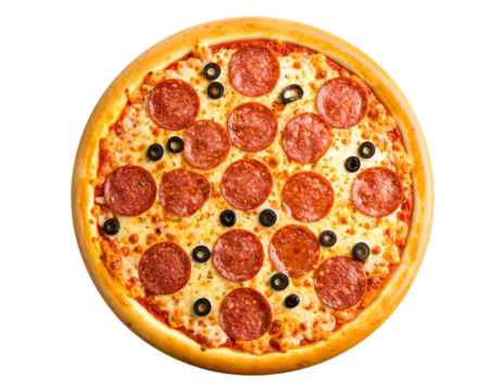 Pizza Slice with Salami and Olives Being Lifted, Cheese Stretching, Side Angle, Transparent PNG