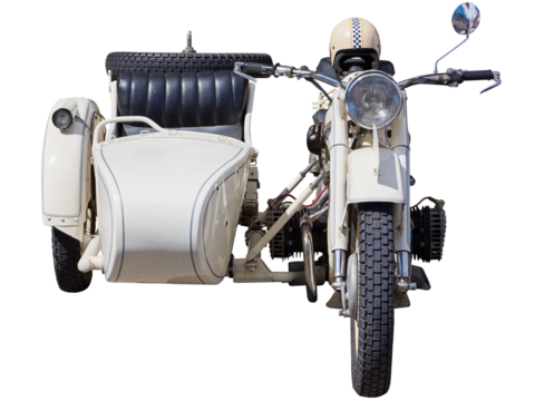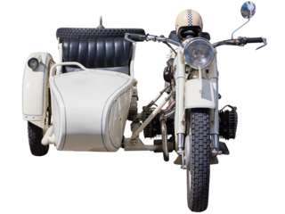 A white motorcycle with a sidecar is displayed against a plain white background, showcasing its classic design.