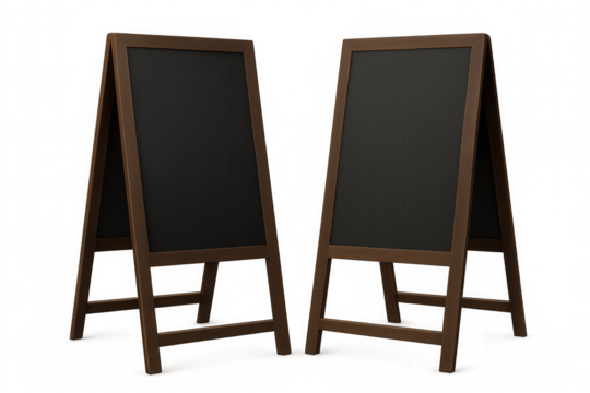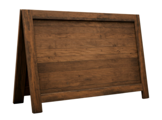An empty wooden A-frame chalkboard with a rustic dark finish stands isolated on a waiting for a message  isolated on transparent background, perfect cutout, PNG