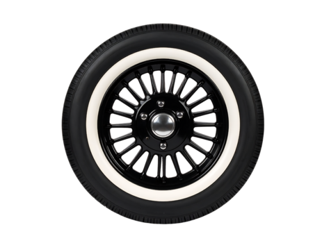 A classic car wheel and tire featuring a black wire rim and a distinct white sidewall.