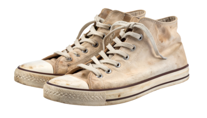 Beige canvas sneakers pair with laces, scuffs, and vintage street wear patina on isolated background