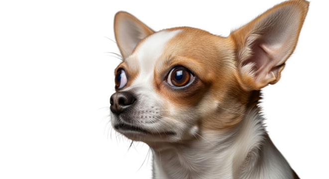 Cute wide-eyed brown and white Chihuahua dog portrait looking curiously sideways isolated PNG with Transparent Background