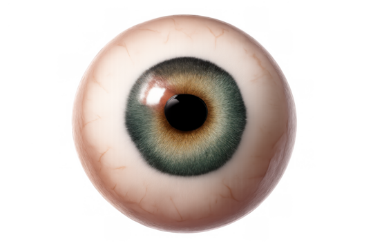 Anatomical illustration of a human eye, showing internal structures like the iris, pupil, and lens, isolated on transparent background