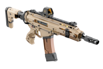 Modern tactical assault rifle with camouflage pattern isolated on transparent background. Modern assault rifle with optic and camouflage finish for tactical use isolated on white background.