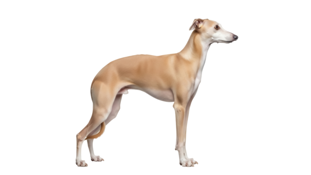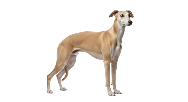 Elegant fawn Whippet dog standing isolated PNG, graceful sighthound breed for design projects and pet-related content