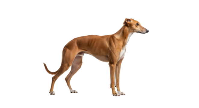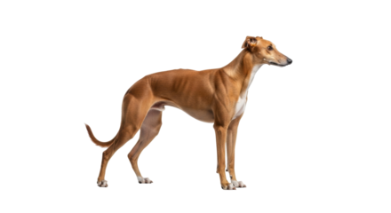 Isolated Greyhound standing in profile, a sleek dog breed known for its incredible speed