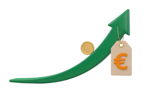 Green arrow pointing up with euro sign isolated PNG, financial growth concept with price tag and coin on transparent background