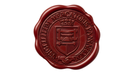 Closeup of a red wax seal isolated on transparent background, featuring intricate heraldic design, a symbol of authenticity and historical significance
