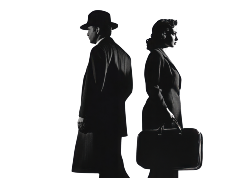 Stylish man and woman in vintage attire, embodying classic elegance and mystery from a bygone era. transparent background