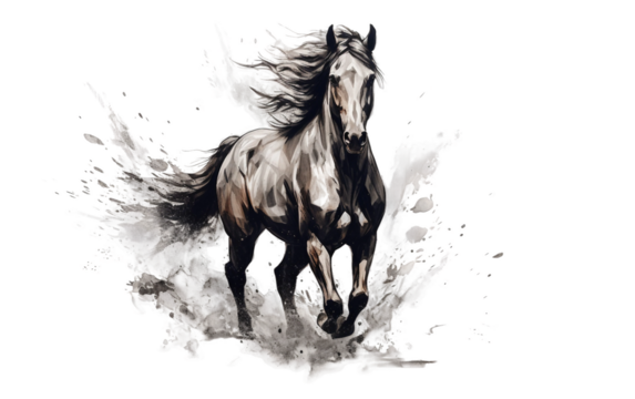 A galloping gray horse with a flowing mane and tail isolated on a white background in dynamic motion on transparent background