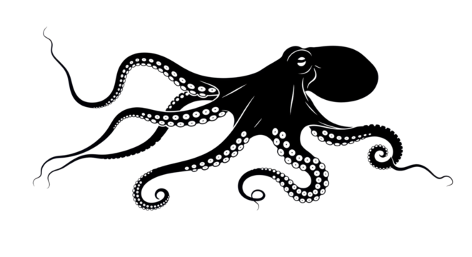 Black silhouette of an octopus isolated PNG with Transparent Background