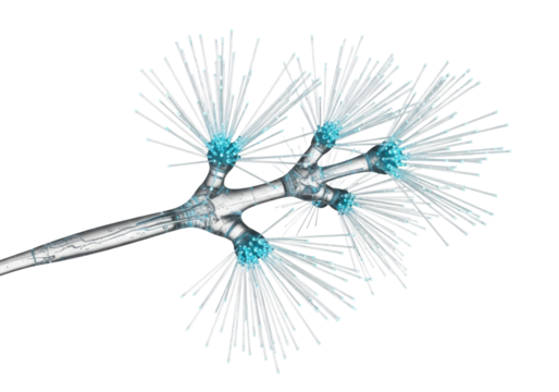 Intricate, futuristic, translucent silicon branch with luminous cyan fiber optic filaments on transparent studio background, photorealistic macro, cutting-edge innovation and digital connectivity