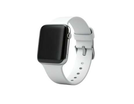A silver smartwatch with a white strap, displaying a blank black screen