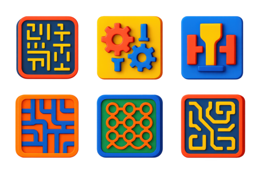 Microfabricated Tech Icons. 3D icon set of microfabricated tech: etched silicon chip surface, MEMS gear structure, nano-scale