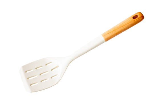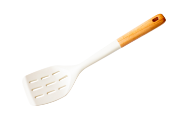 Modern slotted spatula with white silicone head and wooden handle isolated on transparent background, Perfect for kitchen utensil ads, product packaging, and cooking related designs, PNG File