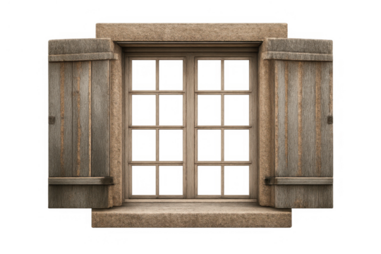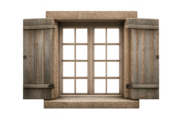 Antique window with a stone sill and frame, complemented by rustic wooden shutters adding a timeless architectural touch