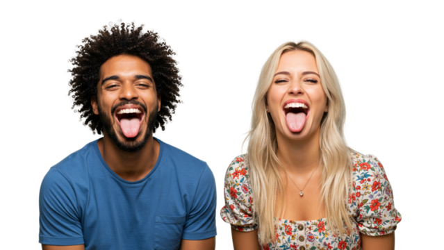 A smiling man and a blonde woman are sticking their tongues out, in a playful and silly mood, posing against a black background.