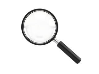 A black magnifying glass with a silver accent is isolated on transparent background for detailed inspection and enhanced visibility