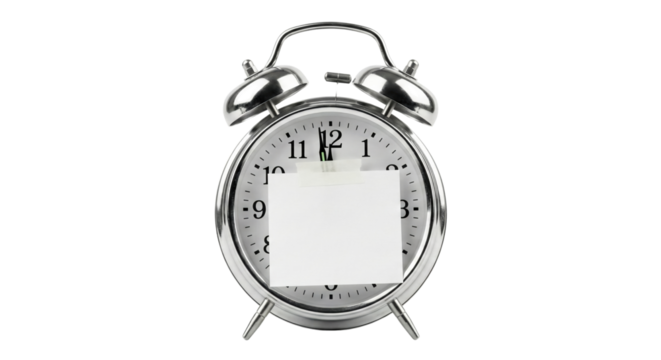 Vintage silver alarm clock, isolated on transparent background for time, punctuality, and retro concepts
