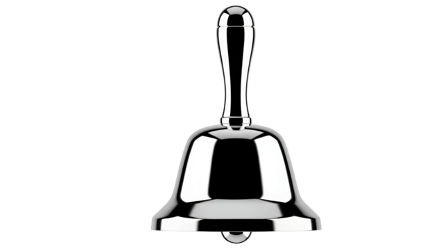 Gleaming metallic silver hand bell with a polished handle isolated against a pure black area for easy selection on transparent background