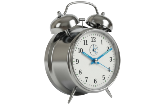 Classic silver alarm clock isolated PNG on transparent background, retro style timepiece for reminders and time management