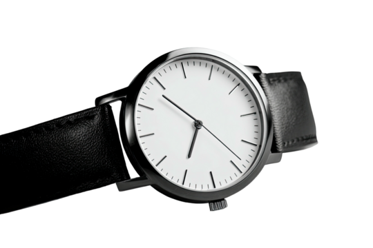 Elegant wristwatch with a minimalist design, featuring a black leather strap on a black background