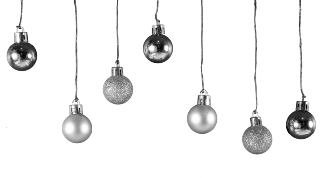 Christmas ornaments isolated on white background. Set of silver and gold christmas balls hanging on ribbon