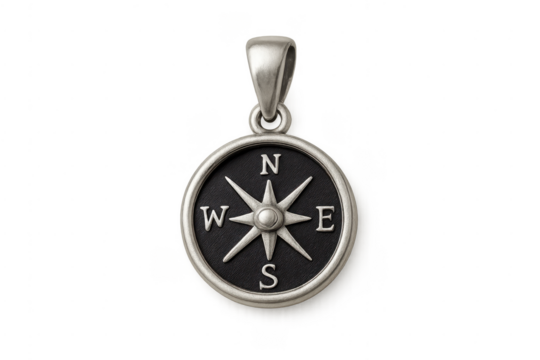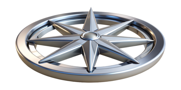 Silver compass rose featuring cardinal directions of north, south, east, and west, isolated on a transparent background for versatile use