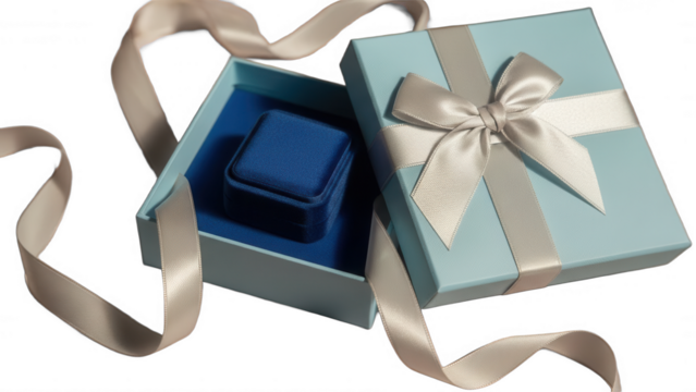 Elegant open blue gift box with a silver ribbon bow and long flowing ribbons, small square velvet jewelry box, luxury packaging for rings or earrings, perfect for proposals or anniversaries