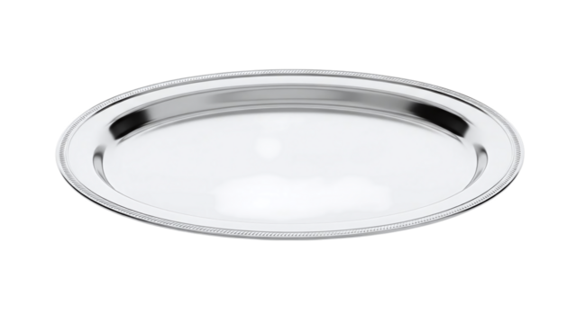 Elegant silver oval serving tray with a decorative beaded rim, ideal for formal events and home decor, isolated on transparent background