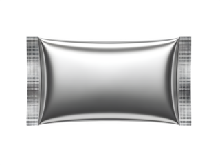 A shiny silver foil pouch with crimped edges  in  setting isolated on transparent background