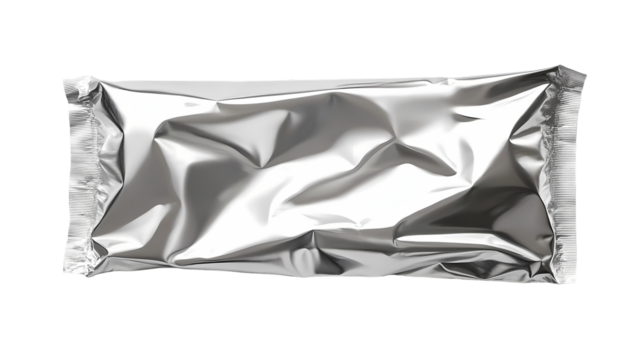 Silver metallic foil snack pouch mockup for potato chips or pretzels with front view and realistic texture for product isolated on transparent background