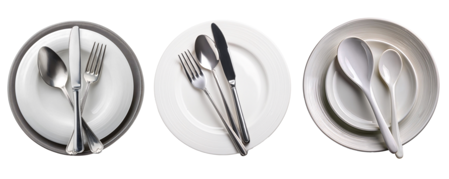 stainless steel knife spoon and fork with white plate isolated on transparent background PNG image