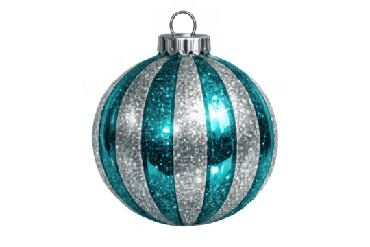 Christmas bauble displaying teal and silver glitter stripes, reflecting light, for festive season decoration, isolated on a transparent background