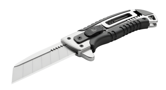 Folding Utility Knife with Black and Silver Handle on Transparent Background