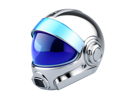 Futuristic silver astronaut helmet with blue visor isolated on transparent background