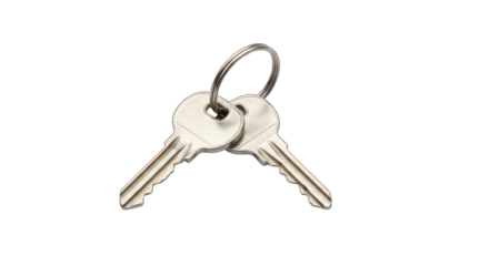 A floating set of silver keys on a keyring against a transparent background