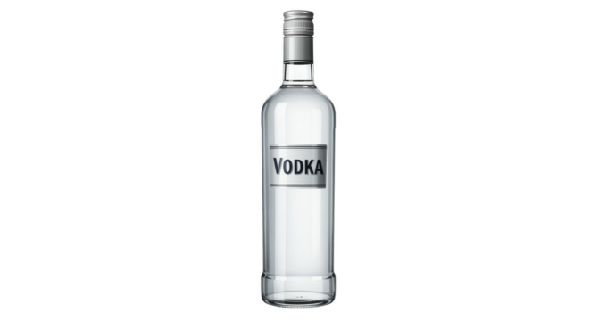 Illustration of Transparent Vodka Bottle with Silver Label on Black Background